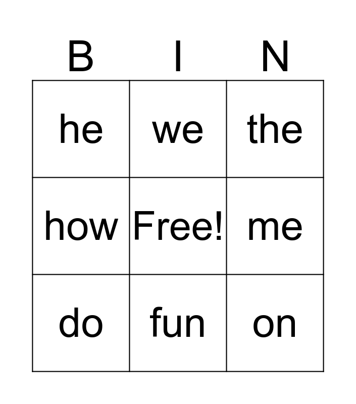 This bingo card has a free space and 20 words: I, in, the, a, can, on, to, he, she, we, be, see, me, some, do, run, fun, how, no and yes.