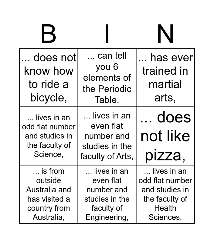 This bingo card has 38 words: Free!, ... is from outside Asia and has visited a country from Asia,, ... is from outside Europe and has visited a country from Europe,, ... is from outside Australia and has visited a country from Australia,, ... is from outside North America and has visited a country from North America,, ... has changed accommodation this academic year,, ... lives in an even flat number and studies in the faculty of Engineering,, ... lives in an odd flat number and studies in the faculty of Biomedical, Sciences., ... lives in an even flat number and studies in the faculty of Arts,, ... lives in an odd flat number and studies in the faculty of Health Sciences,, ... lives in an even flat number and studies in the faculty of Social Sciences, and Law., ... lives in an odd flat number and studies in the faculty of Science,, ... had never seen snow until coming to university,, ... likes rain,, ... does not like pizza,, ... is vegetarian / vegan,, ... has not gone to the cinema this year,, ... has ever trained in martial arts,, ... has never played Darts,, ... has ever thrown a javelin,, ... does not know how to ride a bicycle,, ... has ever gone rowing or kayaking,, ... has never eaten Nutella,, ... does not know how to play poker,, ... would be scared of bungee jumping or jumping with parachute,, ... has tried scuba diving,, ... can tell you 8 characters from Star Wars,, ... can tell you 5 characters from Harry Potter,, ... can tell you 5 presidents of the United States,, ... can tell you 5 events in Olympic athletics,, ... can tell you 8 Marvel superheroes,, ... can tell you 5 lead singers from rock bands,, ... can tell you 5 countries which end in “stan”,, ... can tell you 6 elements of the Periodic Table,, ... can tell you 5 capitals from Africa,, ... can tell you 5 species of dinosaurs,, ... can tell you 5 Italian food specialties, and ... can tell you 7 breeds of dogs,.
