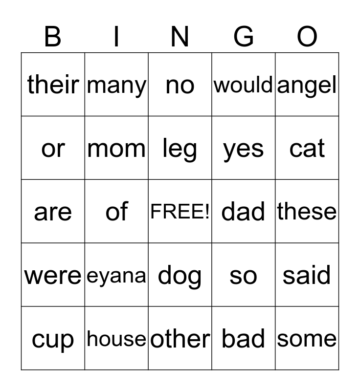 This bingo card has a free space and 24 words: eyana, house, leg, cup, angel, their, or, many, dad, dog, yes, are, so, said, mom, bad, these, no, cat, of, some, were, would and other.