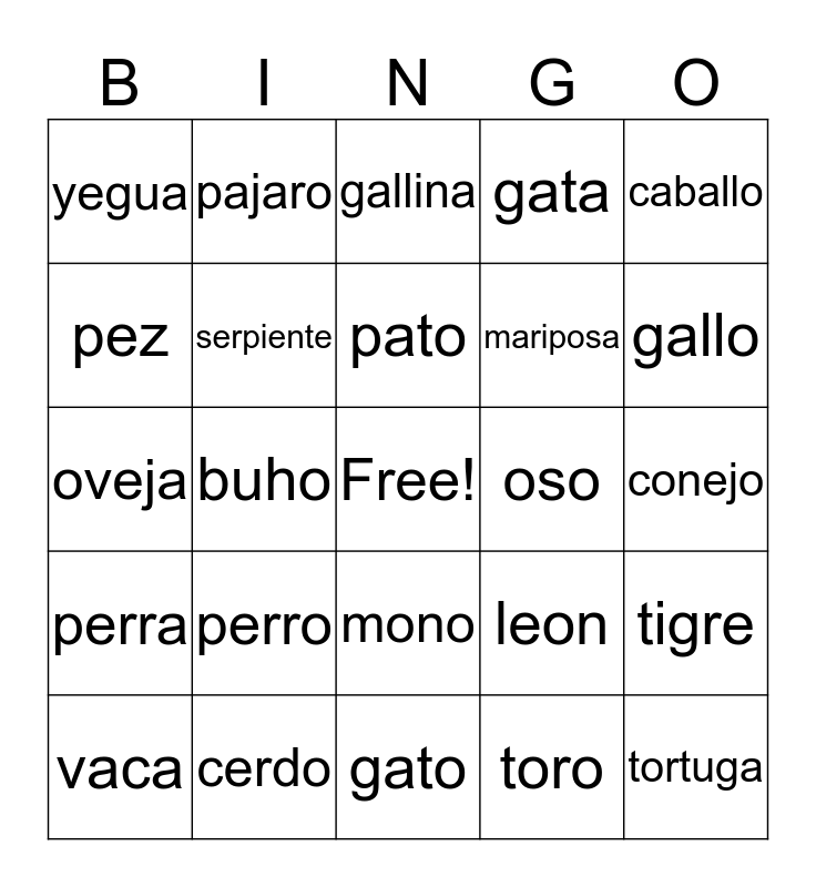 This bingo card has a free space and 25 words: perro, gato, pato, vaca, caballo, yegua, pez, pajaro, oso, mono, mariposa, oveja, leon, tigre, serpiente, elefante, conejo, gallina, gallo, buho, tortuga, cerdo, perra, gata and toro.