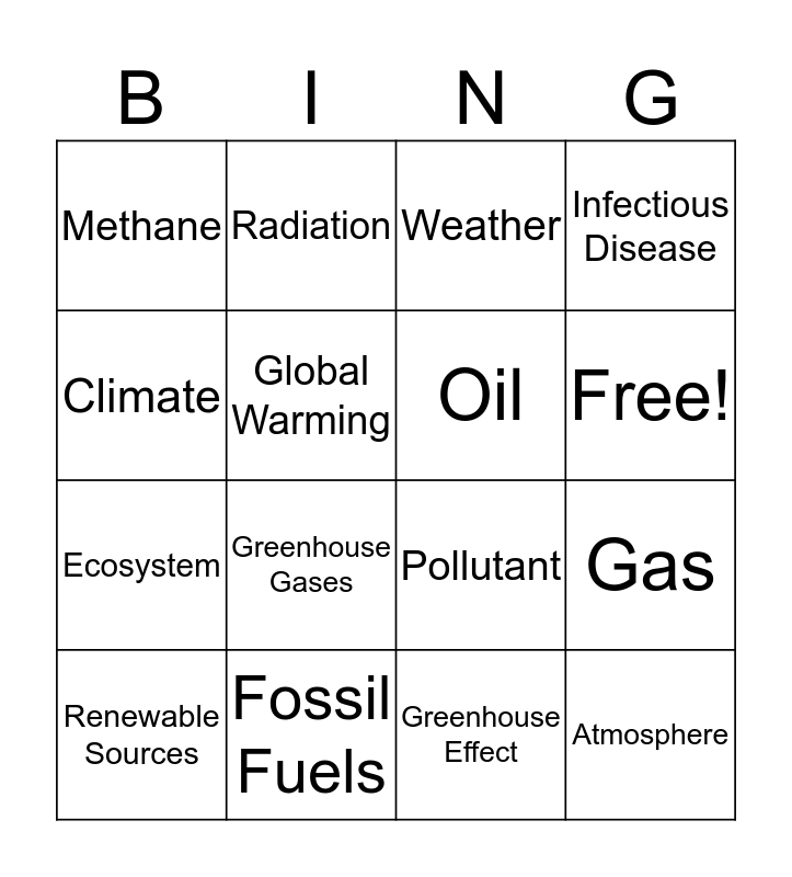 This bingo card has 18 words: Greenhouse Gases, Atmosphere, Weather, Methane, Pollutant, Infectious Disease, Renewable Sources, Radiation, Free!, Ecosystem, Greenhouse Effect, Climate, Gas, Global Warming, Oil, Drought, Fossil Fuels and Radiation.
