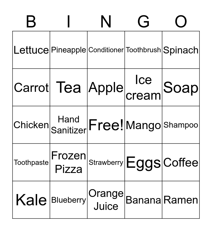 This bingo card has a free space and 24 words: Frozen Pizza, Blueberry, Apple, Kale, Spinach, Lettuce, Carrot, Pineapple, Mango, Strawberry, Ice cream, Chicken, Eggs, Coffee, Tea, Banana, Shampoo, Conditioner, Soap, Hand Sanitizer, Ramen, Toothpaste, Toothbrush and Orange Juice.
