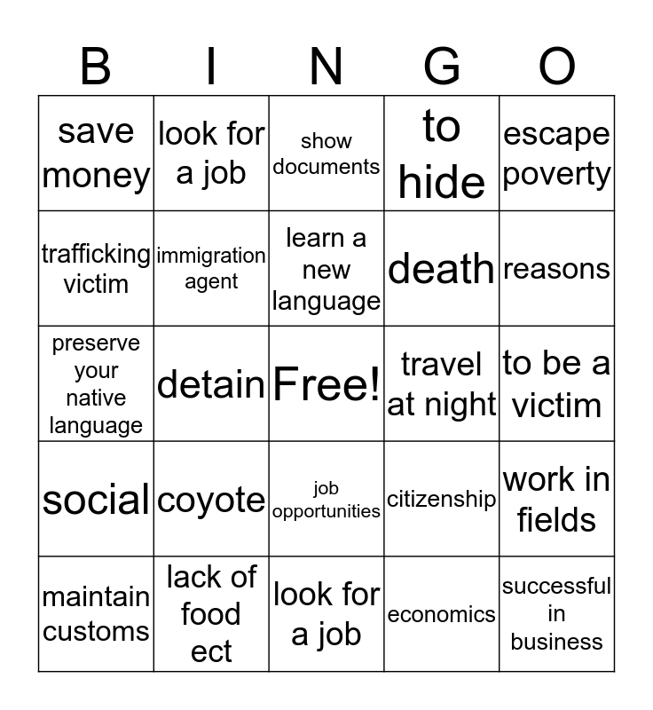 This bingo card has a free space and 24 words: coyote, lack of food ect, learn a new language, maintain customs, escape poverty, save money, trafficking victim, look for a job, travel at night, job opportunities, death, preserve your native language, citizenship, work in fields, immigration agent, economics, to be a victim, show documents, reasons, detain, successful in business, social, to hide and look for a job.