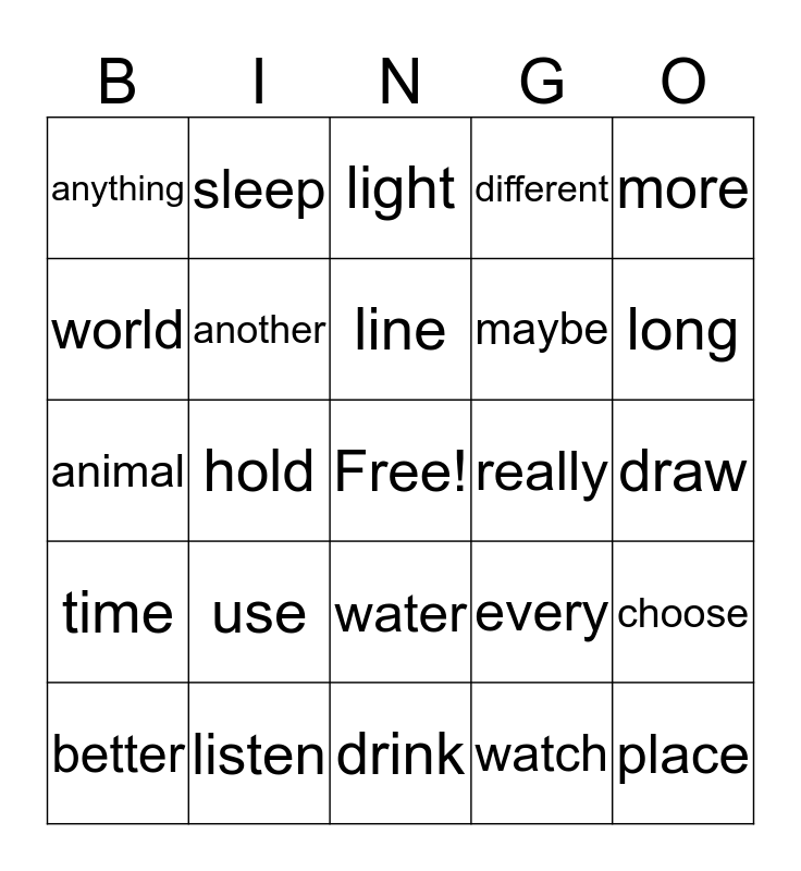 This bingo card has a free space and 24 words: use, listen, line, better, more, anything, world, sleep, really, water, maybe, animal, every, choose, another, watch, draw, light, long, hold, place, time, different and drink.