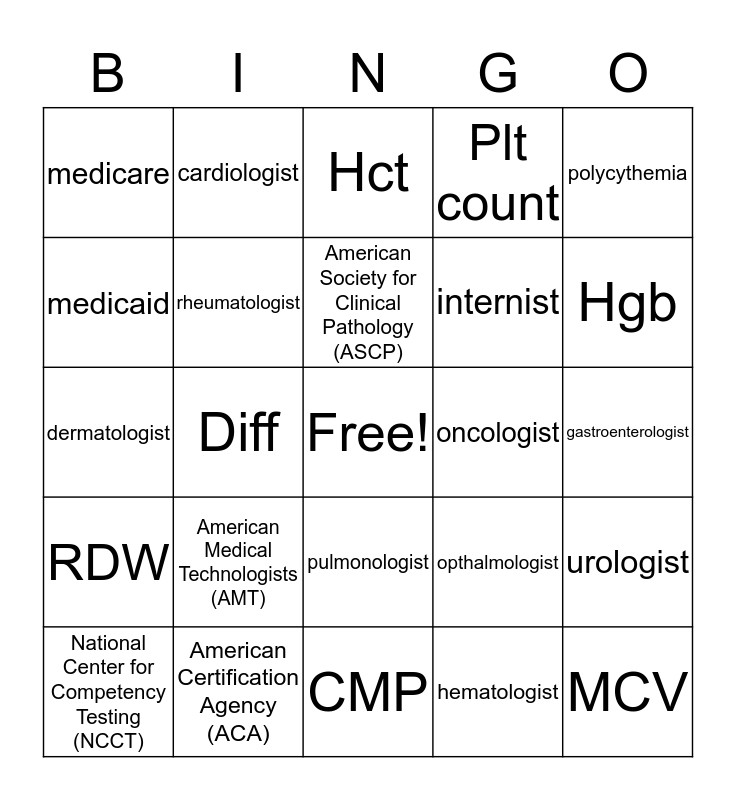 This bingo card has a free space and 24 words: American Medical Technologists (AMT), American Certification Agency (ACA), American Society for Clinical Pathology (ASCP), National Center for Competency Testing (NCCT), polycythemia, medicare, medicaid, cardiologist, oncologist, pulmonologist, internist, dermatologist, opthalmologist, urologist, rheumatologist, hematologist, gastroenterologist, Hct, Hgb, Diff, MCV, RDW, Plt count and CMP.