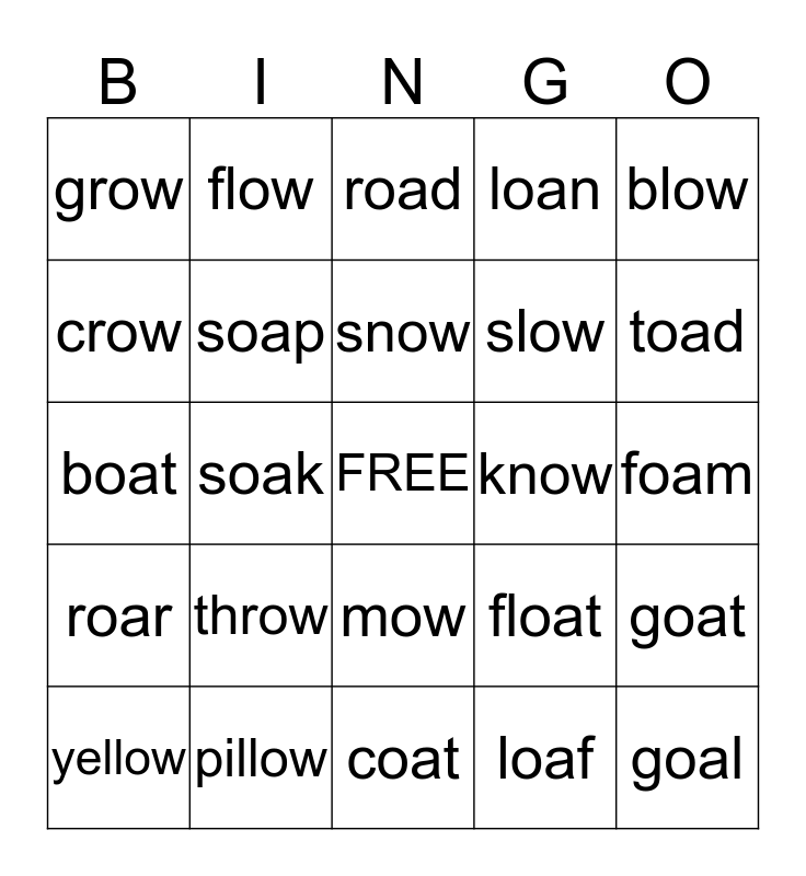 This bingo card has a free space and 24 words: throw, pillow, snow, yellow, blow, grow, crow, flow, know, mow, slow, boat, float, goat, soap, loaf, foam, road, toad, soak, goal, roar, loan and coat.