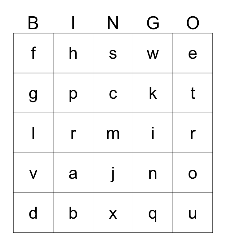 This bingo card has a free space and 24 words: a, b, c, d, e, f, g, h, i, j, k, l, n, o, p, q, r, s, t, r, u, v, w and x.