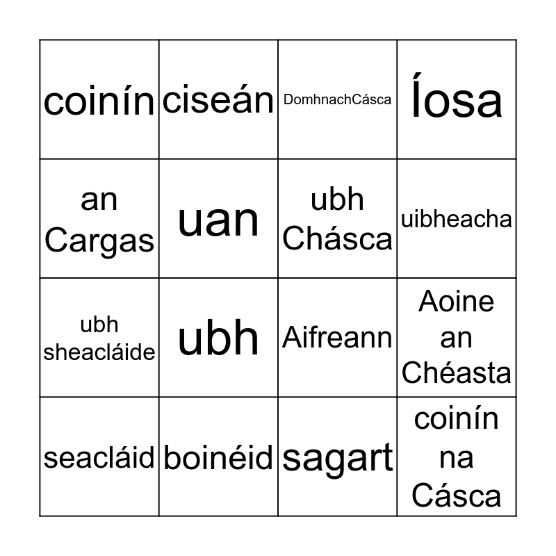 This bingo card has 16 words: seacláid, boinéid, DomhnachCásca, Íosa, an Cargas, ciseán, Aifreann, Aoine an Chéasta, coinín, uan, sagart, uibheacha, ubh sheacláide, ubh, ubh Chásca and coinín na Cásca.