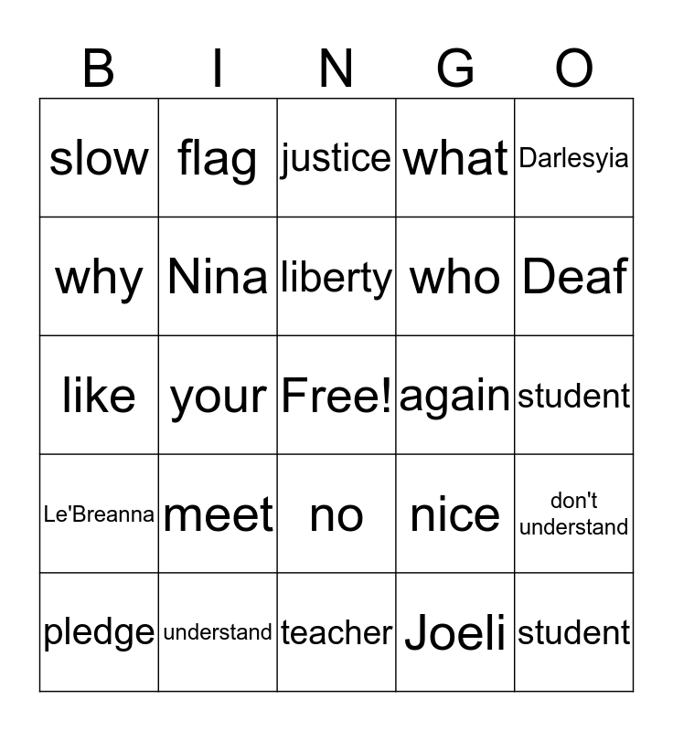 This bingo card has a free space and 34 words: Adryanna, Joeli, Julissa, Cherrish, Le'Breanna, Nina, Darlesyia, pledge, flag, nation, liberty, justice, Texas, God, again, Deaf, understand, like, meet, nice, no, sign, slow, student, teacher, student, what, where, who, why, yes, your, don't understand and thank you.