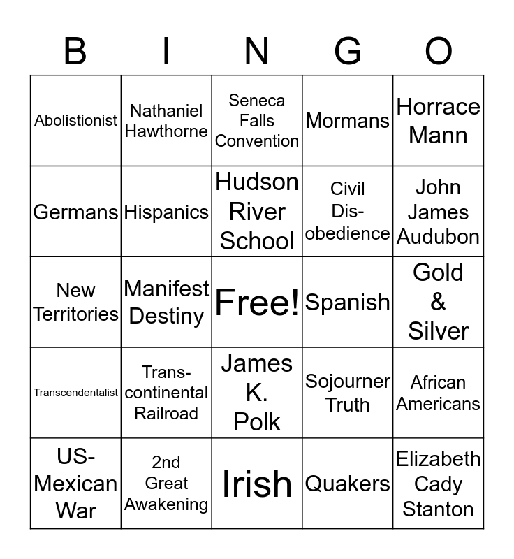 This bingo card has a free space and 24 words: Trans-continental Railroad, 2nd Great Awakening, Hudson River School, US- Mexican War, Horrace Mann, Abolistionist, Germans, Nathaniel Hawthorne, Spanish, James K. Polk, Civil Dis-obedience, New Territories, Sojourner Truth, African Americans, Hispanics, Quakers, Gold & Silver, Seneca Falls Convention, John James Audubon, Manifest Destiny, Elizabeth Cady Stanton, Transcendentalist, Mormans and Irish.