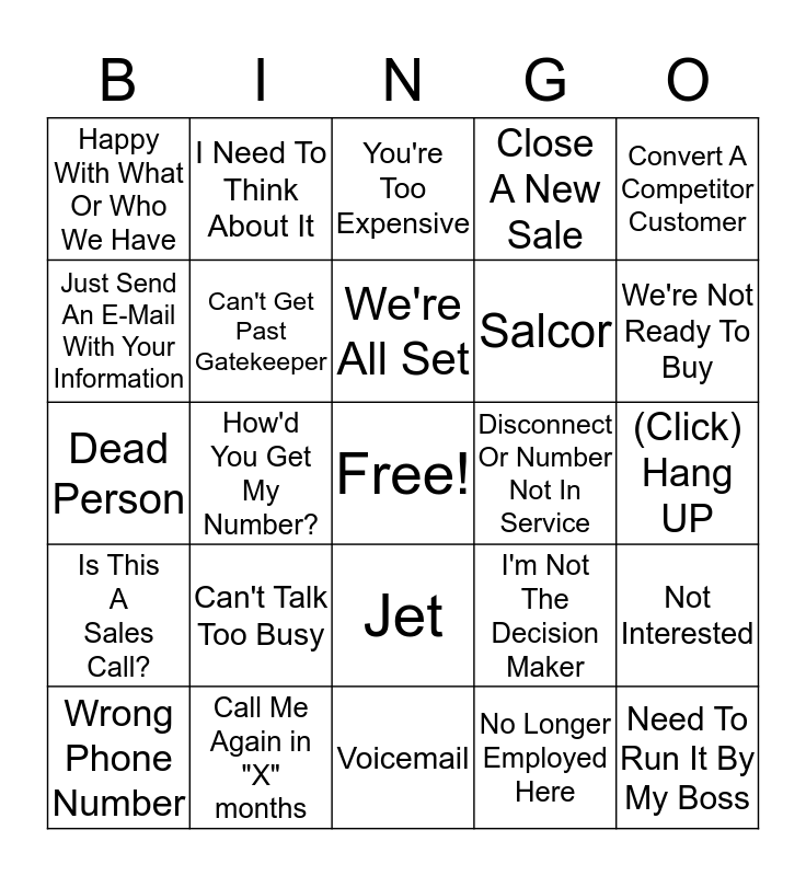 This bingo card has a free space and 24 words: Can't Talk Too Busy, Call Me Again in "X" months, We're All Set, Wrong Phone Number, Convert A Competitor Customer, Happy With What Or Who We Have, Just Send An E-Mail With Your Information, I Need To Think About It, Disconnect Or Number Not In Service, Jet, Salcor, Dead Person, I'm Not The Decision Maker, Not Interested, Can't Get Past Gatekeeper, No Longer Employed Here, (Click) Hang UP, You're Too Expensive, We're Not Ready To Buy, How'd You Get My Number?, Need To Run It By My Boss, Is This A Sales Call?, Close A New Sale and Voicemail.