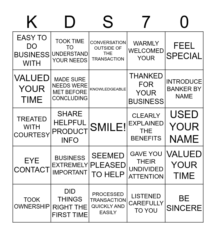 This bingo card has a free space and 24 words: BUSINESS EXTREMELY IMPORTANT, DID THINGS RIGHT THE FIRST TIME, KNOWLEDGEABLE, TOOK OWNERSHIP, FEEL SPECIAL, EASY TO DO BUSINESS WITH, VALUED YOUR TIME, TOOK TIME TO UNDERSTAND YOUR NEEDS, CLEARLY EXPLAINED THE BENEFITS, SEEMED PLEASED TO HELP, THANKED FOR YOUR BUSINESS, TREATED WITH COURTESY, GAVE YOU THEIR UNDIVIDED ATTENTION, VALUED YOUR TIME, MADE SURE NEEDS WERE MET BEFORE CONCLUDING, LISTENED CAREFULLY TO YOU, USED YOUR NAME, CONVERSATION OUTSIDE OF THE TRANSACTION, INTRODUCE BANKER BY NAME, SHARE HELPFUL PRODUCT INFO, BE SINCERE, EYE CONTACT, WARMLY WELCOMED YOUR and PROCESSED TRANSACTION QUICKLY AND EASILY.