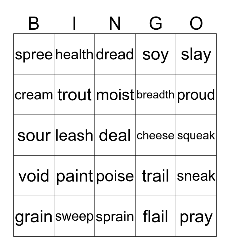 This bingo card has a free space and 24 words: paint, sweep, moist, grain, slay, spree, cream, health, cheese, poise, breadth, sour, trail, sneak, trout, flail, squeak, dread, proud, leash, pray, void, soy and sprain.