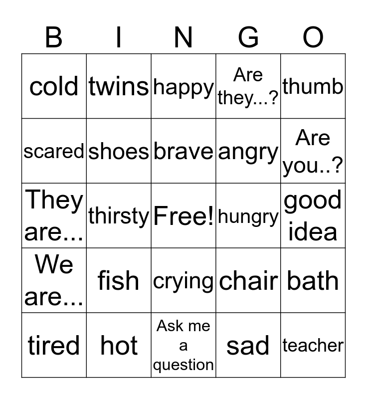 This bingo card has a free space and 24 words: fish, hot, brave, tired, thumb, cold, scared, twins, hungry, crying, angry, They are..., chair, bath, shoes, sad, good idea, happy, Are you..?, thirsty, teacher, We are..., Are they...? and Ask me a question.