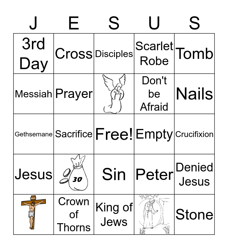 This bingo card has 4 images, a free space and 20 words: Tomb, 3rd Day, Cross, Disciples, Empty, Crucifixion, Gethsemane, Prayer, Peter, Denied Jesus, Messiah, Crown of Thorns, King of Jews, Scarlet Robe, Nails, Jesus, Sacrifice, Sin, Don't be Afraid and Stone.