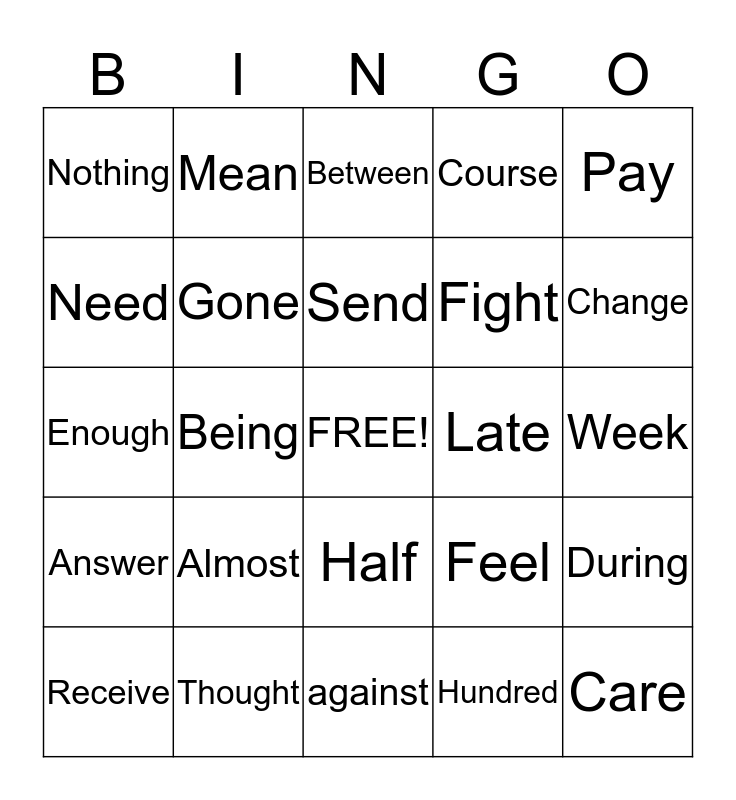 This bingo card has a free space and 24 words: Almost, Thought, Send, Receive, Pay, Nothing, Need, Mean, Late, Half, Fight, Enough, Feel, During, Gone, Hundred, Week, Between, Change, Being, Care, Answer, Course and against.