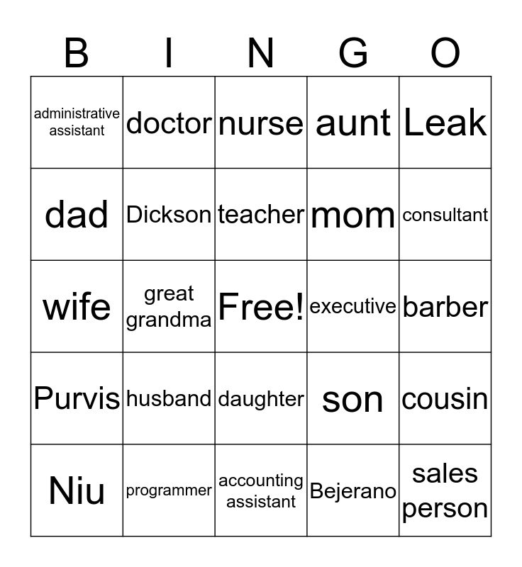This bingo card has a free space and 34 words: Rowland, Bejerano, Wright, Glasco, Purvis, Dickson, Leak, Niu, doctor, lawyer, teacher, nurse, coach, student, executive, consultant, programmer, wife, husband, son, daughter, dental assistant, administrative assistant, barber, accounting assistant, sales person, aunt, uncle, mom, dad, grandma, great grandma, cousin and Zang.