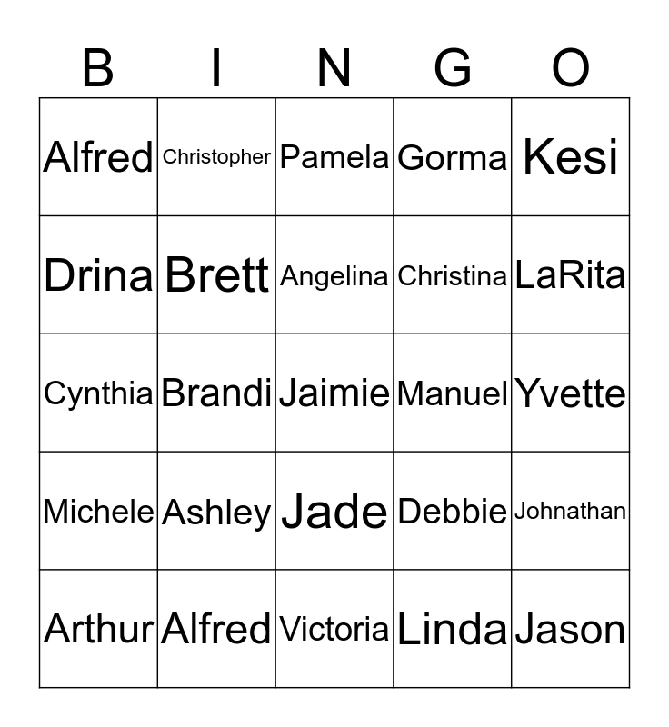 This bingo card has a free space and 37 words: Free!, Vivian, Steven, Brett, Johnathan, Ashley, Angelina, Jason, Kesi, Erin, Brandi, Gorma, Jason, Yvette, Drina, Michele, Phyllis, Pamela, Jade, Manuel, Alfred, LaRita, Arthur, Victoria, Alexis, Linda, Christopher, Erin, LeAnne, Aliya, Jacob, Alfred, Cynthia, Larry, Debbie, Christina and Autumn.