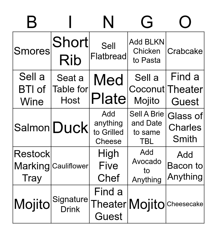 This bingo card has 25 words: Cauliflower, Find a Theater Guest, Med Plate, Mojito, Crabcake, Smores, Sell a BTl of Wine, Short Rib, Sell A Brie and Date to same TBL, High Five Chef, Sell a Coconut Mojito, Salmon, Add Avocado to Anything, Add Bacon to Anything, Seat a Table for Host, Cheesecake, Glass of Charles Smith, Sell Flatbread, Find a Theater Guest, Duck, Add anything to Grilled Cheese, Signature Drink, Restock Marking Tray, Add BLKN Chicken to Pasta and Mojito.