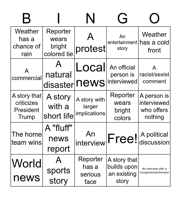 This bingo card has 25 words: A "fluff" news report, Reporter has a serious face, Local news, World news, Weather has a cold front, Weather has a chance of rain, A commercial, Reporter wears bright colored tie, Reporter wears bright colors, An interview, An official person is interviewed, A story that criticizes President Trump, Free!, A political discussion, A natural disaster, An interview with a Congressman/Senator, A person is interviewed who offers nothing, A protest, A racist/sexist comment, A story with a short life, A story with larger implications, A sports story, The home team wins, An entertainment story and A story that builds upon an existing story.