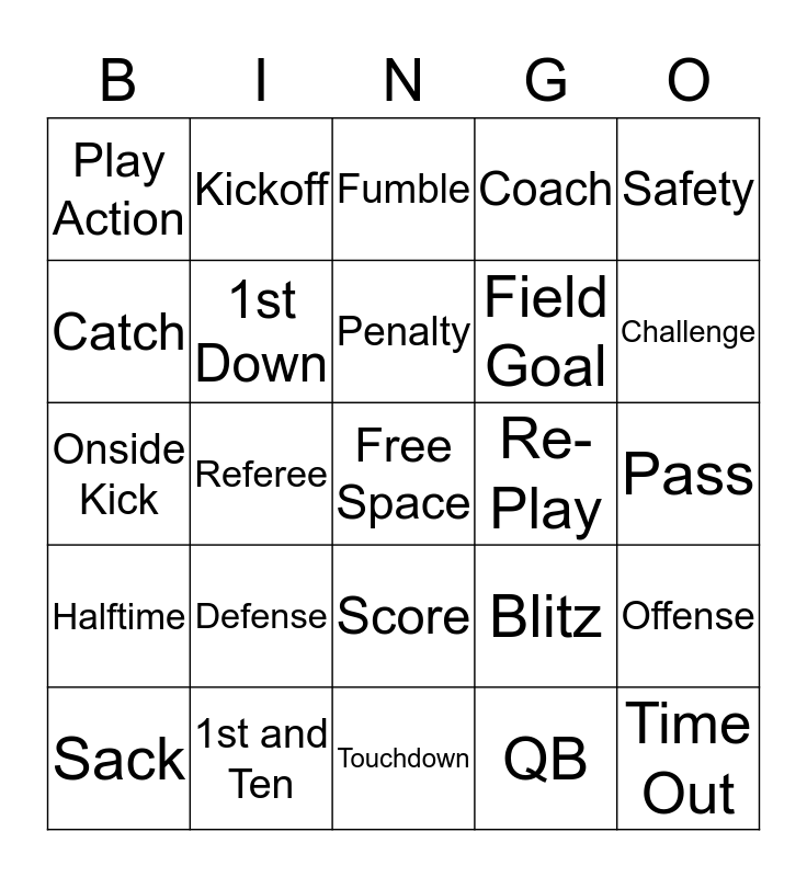 This bingo card has a free space and 24 words: Defense, 1st and Ten, Penalty, Sack, Safety, Play Action, Catch, Kickoff, Re-Play, Score, Field Goal, Onside Kick, Blitz, Offense, 1st Down, QB, Pass, Fumble, Challenge, Referee, Time Out, Halftime, Coach and Touchdown.