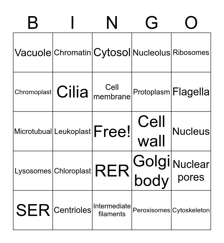 This bingo card has a free space and 24 words: Chloroplast, Centrioles, Cell membrane, SER, Ribosomes, Vacuole, Chromoplast, Chromatin, Cell wall, RER, Protoplasm, Microtubual, Golgi body, Nuclear pores, Cilia, Peroxisomes, Nucleus, Cytosol, Flagella, Leukoplast, Cytoskeleton, Lysosomes, Nucleolus and Intermediate filaments.