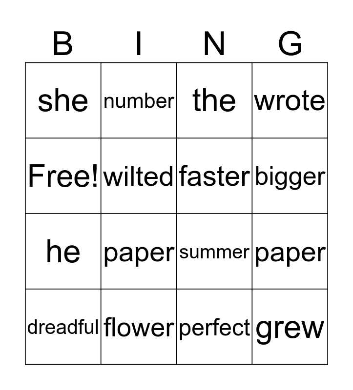 This bingo card has 16 words: flower, paper, the, she, he, number, summer, perfect, Free!, wilted, dreadful, wrote, paper, bigger, faster and grew.