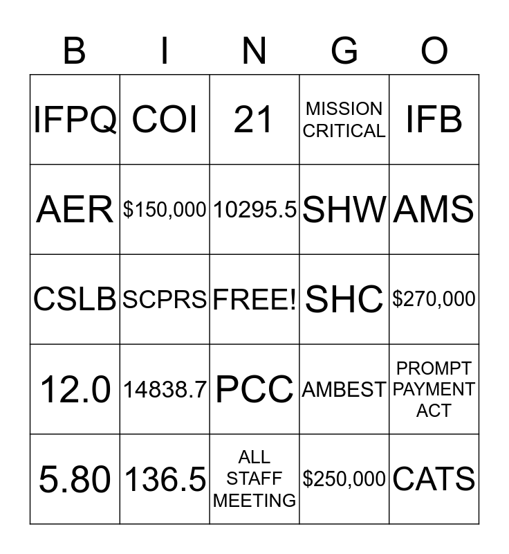 This bingo card has a free space and 24 words: 14838.7, 136.5, 10295.5, 5.80, IFB, IFPQ, AER, COI, SHC, PCC, SHW, CSLB, AMBEST, PROMPT PAYMENT ACT, $150,000, $250,000, $270,000, 21, AMS, SCPRS, CATS, 12.0, MISSION CRITICAL and ALL STAFF MEETING.