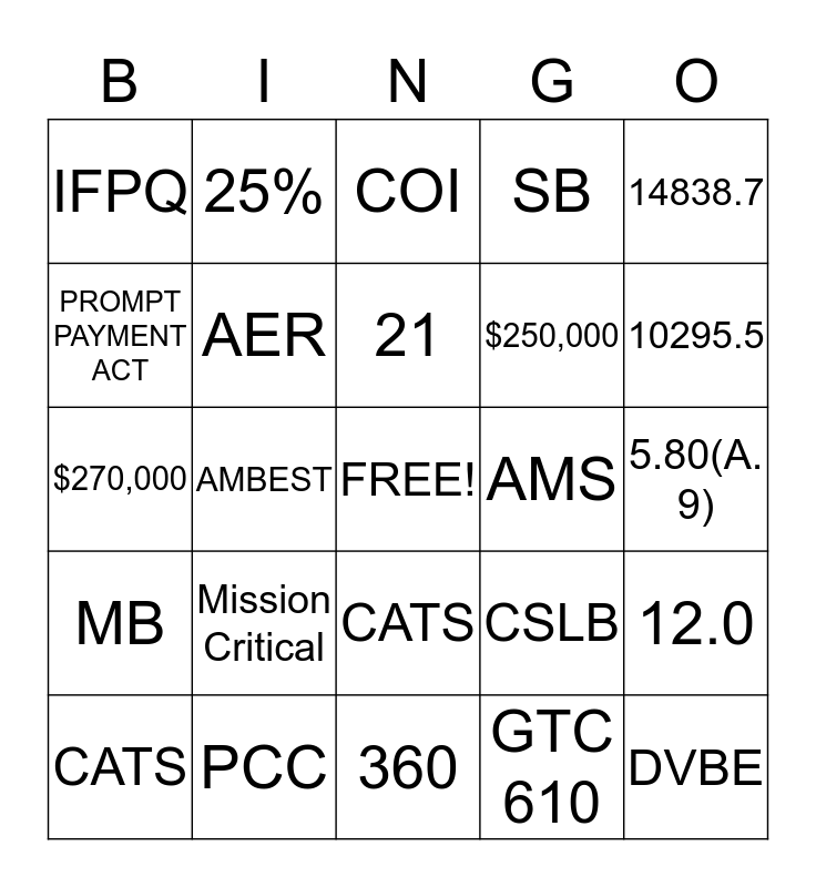 This bingo card has a free space and 24 words: Mission Critical, PCC, 21, CATS, 14838.7, IFPQ, PROMPT PAYMENT ACT, 25%, AMS, CATS, $250,000, $270,000, CSLB, 12.0, AER, GTC 610, 5.80(A. 9), COI, 10295.5, AMBEST, DVBE, MB, SB and 360.