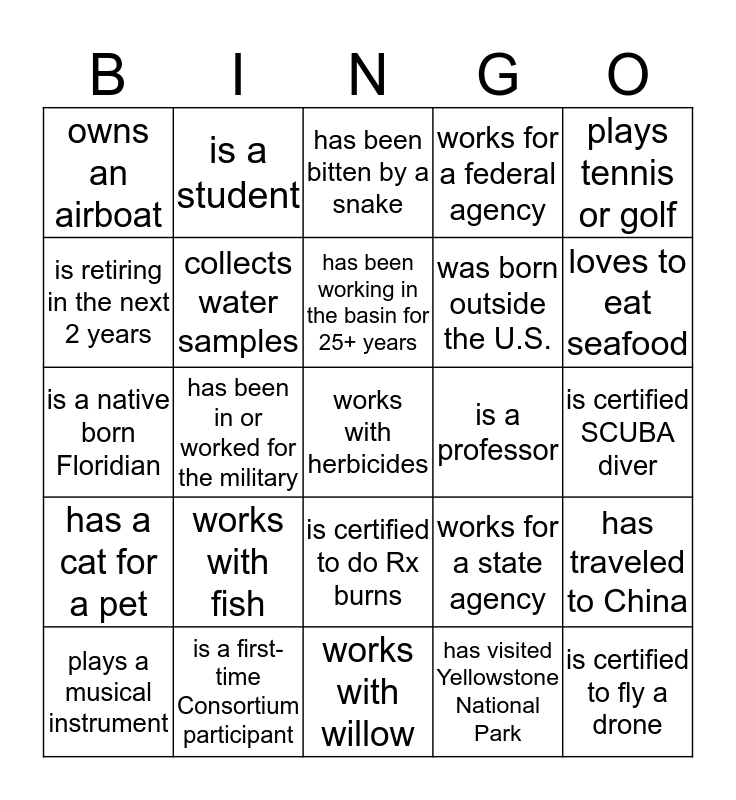 This bingo card has 25 words: works with fish, works with willow, has been working in the basin for 25+ years, plays a musical instrument, plays tennis or golf, owns an airboat, is retiring in the next 2 years, is a student, is a professor, is certified to do Rx burns, was born outside the U.S., is a native born Floridian, works for a state agency, has traveled to China, collects water samples, is certified to fly a drone, is certified SCUBA diver, has been bitten by a snake, loves to eat seafood, has been in or worked for the military, works with herbicides, is a first-time Consortium participant, has a cat for a pet, works for a federal agency and has visited Yellowstone National Park.