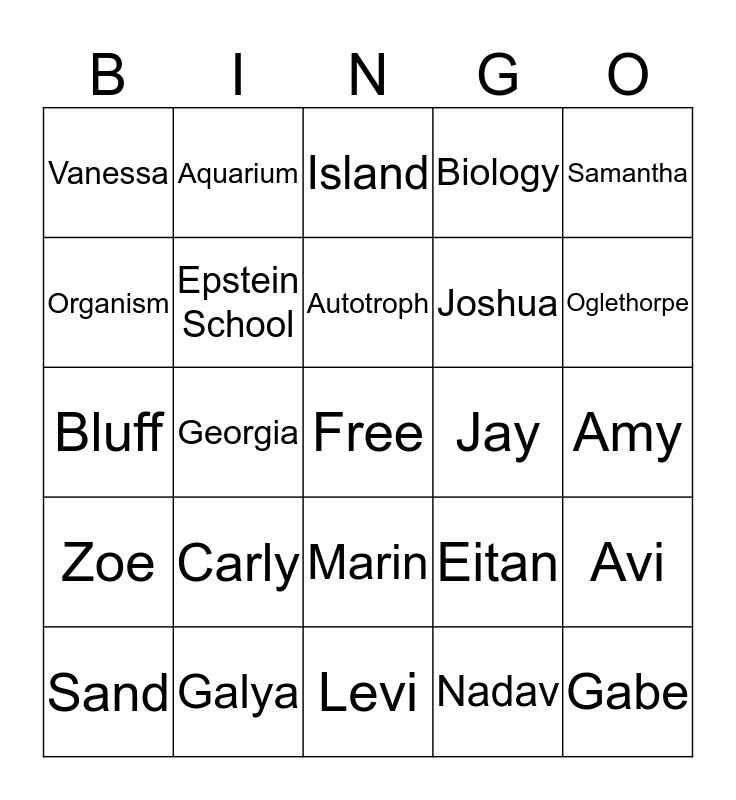 This bingo card has a free space and 74 words: Coastal, Skidaway, Island, Science, Taxonomy, Trawl, Beach, Seashell, Sand, Savannah, Mickve Israel, River, Autotroph, Organism, Classify, Georgia, Tides, Oglethorpe, Marsh, Bluff, Epstein School, Aquarium, Biology, Marine, Gabe, Fish, Lowlands, Shira, Josh, Elaine, Samantha, Yaron, Tal, Zivan, Chloe, Nadav, Audrey, Hannah, Sydney, Zev, Levi, Galya, Asher, Rayna, Cole, Vanessa, Shira, Carly, Rotem, Maya, Amy, Sylvie, Amy, Jordan, Jeremy, Sadie, Marin, Elijah, Roy, Avi, Joshua, Micayla, Zoe, Tiffany, Jay, Alexa, Jessica, Jack, Eitan, Avi, Nathan, Water, Sunshine and Humidity.