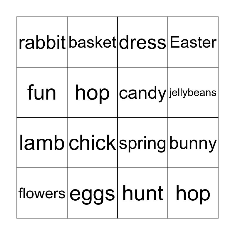 This bingo card has 16 words: eggs, bunny, dress, rabbit, lamb, basket, spring, hunt, fun, hop, flowers, Easter, chick, jellybeans, candy and hop.