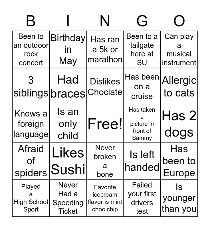 This bingo card has a free space and 24 words: Likes Sushi, Never Had a Speeding Ticket, Dislikes Choclate, Played a High School Sport, Can play a musical instrument, Been to an outdoor rock concert, 3 siblings, Birthday in May, Has taken a picture in front of Sammy, Never broken a bone, Has been on a cruise, Knows a foreign language, Is left handed, Has been to Europe, Had braces, Failed your first drivers test, Has 2 dogs, Has ran a 5k or marathon, Allergic to cats, Is an only child, Is younger than you, Afraid of spiders, Been to a tailgate here at SU and Favorite icecream flavor is mint choc.chip.