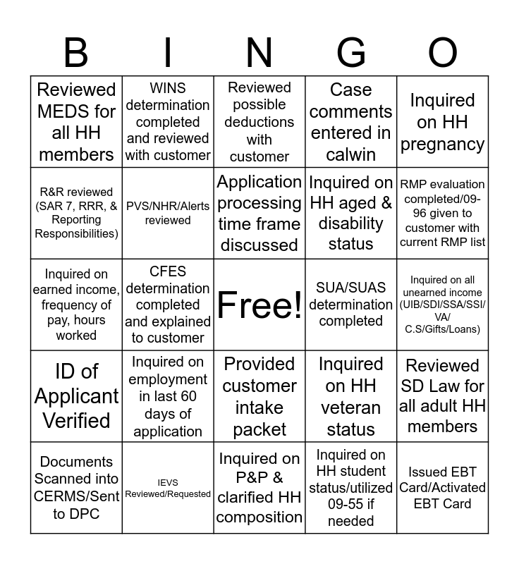 This bingo card has a free space and 25 words: ID of Applicant Verified, IEVS Reviewed/Requested, Inquired on P&P & clarified HH composition, Inquired on HH student status/utilized 09-55 if needed, Inquired on HH pregnancy, Reviewed MEDS for all HH members, WINS determination completed and reviewed with customer, Reviewed possible deductions with customer, SUA/SUAS determination completed, Reviewed SD Law for all adult HH members, R&R reviewed (SAR 7, RRR, & Reporting Responsibilities), PVS/NHR/Alerts reviewed, SOF printed and given to customer, Inquired on HH veteran status, RMP evaluation completed/09-96 given to customer with current RMP list, Documents Scanned into CERMS/Sent to DPC, CFES determination completed and explained to customer, Application processing time frame discussed, Inquired on HH aged & disability status, Inquired on all unearned income (UIB/SDI/SSA/SSI/ VA/ C.S/Gifts/Loans), Inquired on earned income, frequency of pay, hours worked, Inquired on employment in last 60 days of application, Provided customer intake packet, Case comments entered in calwin and Issued EBT Card/Activated EBT Card.
