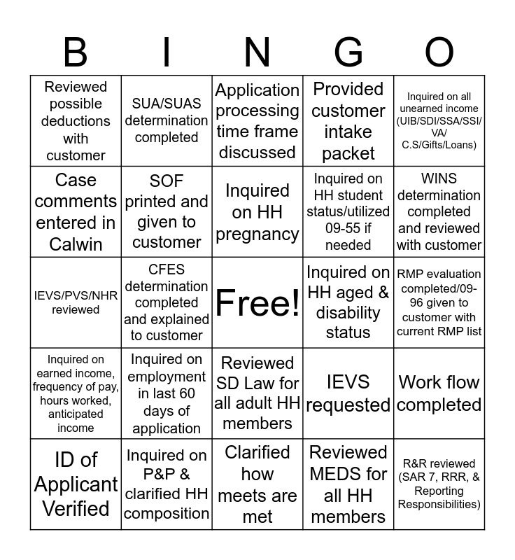 This bingo card has a free space and 27 words: ID of Applicant Verified, Inquired on P&P & clarified HH composition, Inquired on HH pregnancy, Reviewed MEDS for all HH members, WINS determination completed and reviewed with customer, Reviewed possible deductions with customer, SUA/SUAS determination completed, Reviewed SD Law for all adult HH members, Inquired on HH student status/utilized 09-55 if needed, R&R reviewed (SAR 7, RRR, & Reporting Responsibilities), IEVS/PVS/NHR reviewed, SOF printed and given to customer, Inquired on HH veteran status, IEVS requested, RMP evaluation completed/09-96 given to customer with current RMP list, Documents Scanned into CERMS/Sent to DPC, CFES determination completed and explained to customer, Application processing time frame discussed, Inquired on HH aged & disability status, Inquired on all unearned income (UIB/SDI/SSA/SSI/ VA/ C.S/Gifts/Loans), Inquired on earned income, frequency of pay, hours worked, anticipated income, Inquired on employment in last 60 days of application, Clarified how meets are met, Provided customer intake packet, Work flow completed, Case comments entered in Calwin and Issued EBT Card/Activated EBT Card.