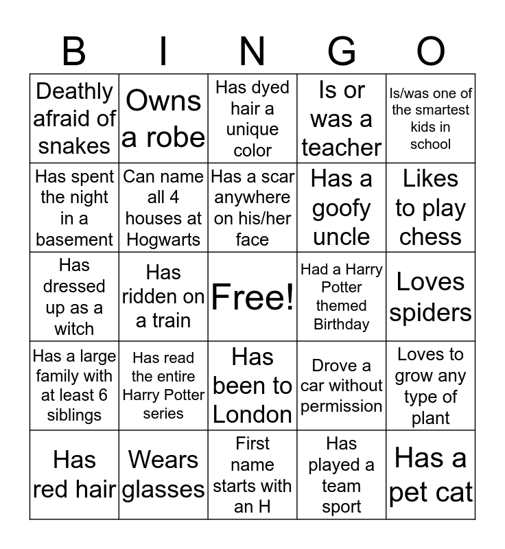 This bingo card has a free space and 24 words: Has read the entire Harry Potter series, Wears glasses, Has a scar anywhere on his/her face, Has red hair, Is/was one of the smartest kids in school, Deathly afraid of snakes, Has spent the night in a basement, Owns a robe, Had a Harry Potter themed Birthday, Has been to London, Has a goofy uncle, Has dressed up as a witch, Drove a car without permission, Loves to grow any type of plant, Can name all 4 houses at Hogwarts, Has played a team sport, Loves spiders, Has dyed hair a unique color, Likes to play chess, Has ridden on a train, Has a pet cat, Has a large family with at least 6 siblings, Is or was a teacher and First name starts with an H.