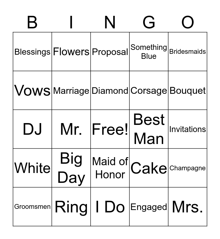 This bingo card has a free space and 24 words: Big Day, Ring, Diamond, Groomsmen, Bridesmaids, Blessings, Vows, Flowers, Best Man, Maid of Honor, Corsage, DJ, Cake, Champagne, Marriage, Engaged, Invitations, Proposal, Bouquet, Mr., Mrs., White, Something Blue and I Do.