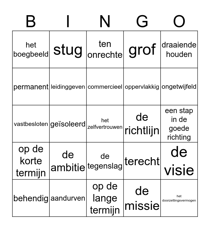 This bingo card has a free space and 24 words: de ambitie, aandurven, commercieel, behendig, draaiende houden, het boegbeeld, permanent, stug, de richtlijn, de tegenslag, oppervlakkig, vastbesloten, terecht, de visie, leidinggeven, de missie, een stap in de goede richting, ten onrechte, ongetwijfeld, geïsoleerd, het doorzettingsvermogen, op de korte termijn, grof and op de lange termijn.