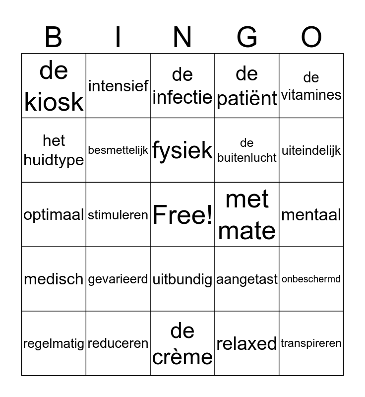 This bingo card has a free space and 27 words: aangetast, blootstellen aan, de buitenlucht, de crème, het huidtype, de infectie, intensief, medisch, met mate, onbeschermd, optimaal, de patiënt, regelmatig, reduceren, uiteindelijk, verstomd, besmettelijk, fysiek, gevarieerd, de kiosk, mentaal, relaxed, stimuleren, transpireren, uitbundig, de vitamines and de voedingsstoffen.
