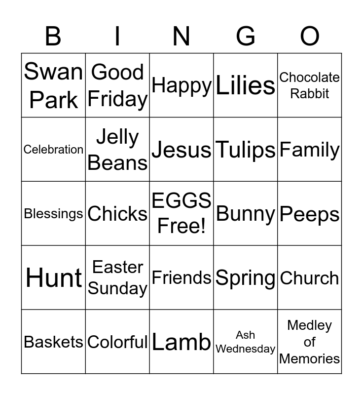 This bingo card has a free space and 24 words: Easter Sunday, Colorful, Jesus, Baskets, Chocolate Rabbit, Swan Park, Celebration, Good Friday, Bunny, Friends, Tulips, Blessings, Spring, Church, Jelly Beans, Ash Wednesday, Peeps, Happy, Family, Chicks, Medley of Memories, Hunt, Lilies and Lamb.
