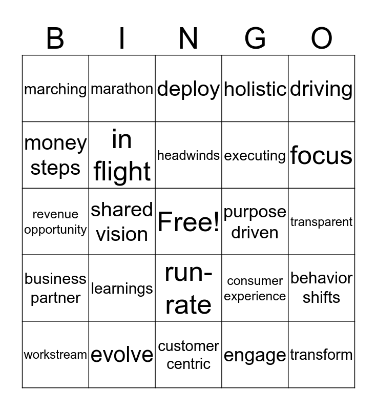 This bingo card has a free space and 24 words: learnings, evolve, headwinds, workstream, driving, marching, money steps, marathon, purpose driven, run-rate, executing, revenue opportunity, consumer experience, behavior shifts, in flight, engage, transparent, deploy, focus, shared vision, transform, business partner, holistic and customer centric.
