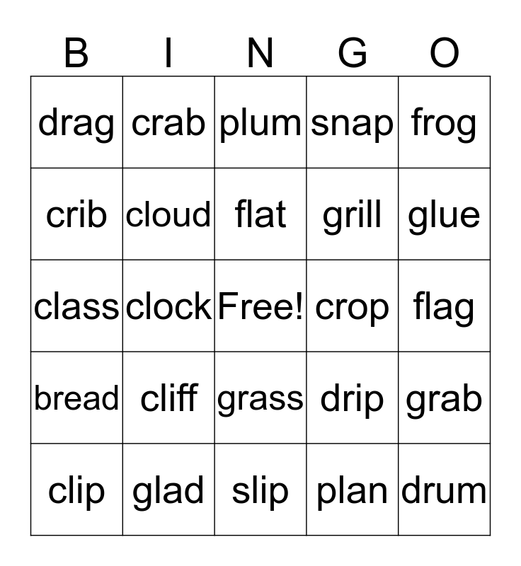 This bingo card has a free space and 24 words: cliff, glad, flat, clip, frog, drag, crib, crab, crop, grass, grill, class, drip, grab, cloud, plan, flag, plum, glue, clock, drum, bread, snap and slip.
