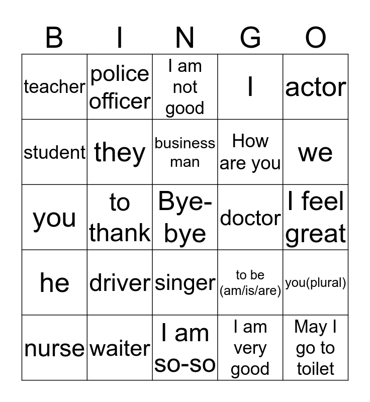This bingo card has a free space and 24 words: driver, waiter, business man, nurse, actor, teacher, student, police officer, doctor, singer, How are you, you, to be (am/is/are), you(plural), they, I am very good, I feel great, I am not good, we, to thank, May I go to toilet, he, I and I am so-so.