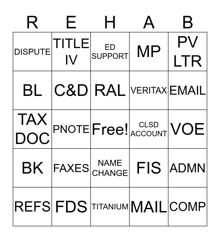 This bingo card has a free space and 24 words: REFS, FAXES, RAL, MAIL, PV LTR, DISPUTE, TITLE IV, ED SUPPORT, CLSD ACCOUNT, VOE, TAX DOC, C&D, FIS, ADMN, BL, FDS, TITANIUM, MP, EMAIL, BK, PNOTE, NAME CHANGE, VERITAX and COMP.