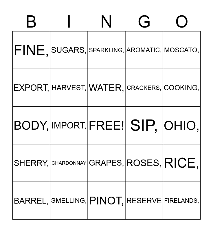 This bingo card has a free space and 66 words: BISTRO,, CHEESE,, BEVERAGES,, RICE,, APPLE,, FRUIT,, SUGARS,, ACIDS,, WATER,, YEAST,, GRAPES,, CALIFORNIA,, OHIO,, MOSCATO,, TASTING,, EXPORT,, IMPORT,, FINE,, CORK,, CRACKERS,, CHARDONNAY, SHERRY,, AROMATIC,, HIDDEN.LAKES,, PUT.N.BAY,, CELLARS,, V.I.P., BOTTLES,, FIRELANDS,, MON.AMI, BARREL,, CATAWBA, DESSERT,, CANDLE.LIGHT, ROSES,, SMELLING,, BALANCE,, BODY,, RESERVE, CRISP, HARVEST,, BLEND,, SIP,, SWIRL,, PAIRING,, OPENER,, COOKING,, LABELING,, FLAWS,, AROMAS,, LEAVES,, HERBS,, SPICES,, RIESLING,, BLANC,, HARMONIOUS,, BLOOMY,HARD,, CHAMPAGNE,, SPARKLING,, PINOT,, MERLOT,, PORT,, ITALY,, CHILE,, CLIMANT, and REGIONS.