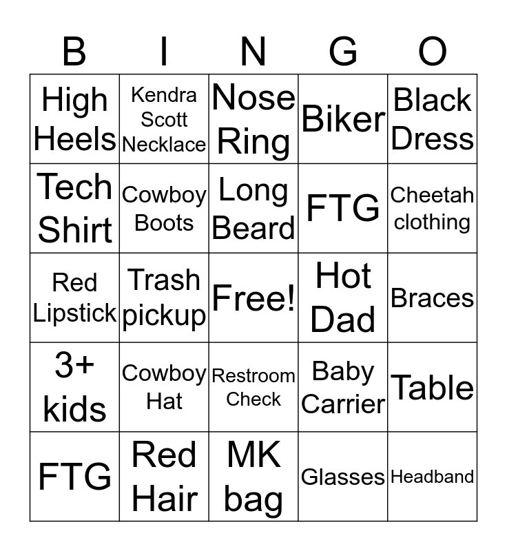This bingo card has a free space and 24 words: Cowboy Hat, Red Hair, Long Beard, FTG, Black Dress, High Heels, Tech Shirt, Kendra Scott Necklace, Hot Dad, Restroom Check, FTG, Red Lipstick, Baby Carrier, Table, Cowboy Boots, Glasses, Braces, Nose Ring, Cheetah clothing, Trash pickup, Headband, 3+ kids, Biker and MK bag.