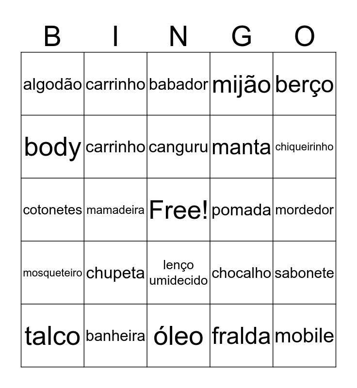 This bingo card has a free space and 30 words: banheira, macacão, mamadeira, hidratante, algodão, babador, carrinho, lenço umidecido, pomada, óleo, mordedor, mobile, fralda, bebê conforto, chiqueirinho, talco, chocalho, mosqueteiro, chupeta, berço, cotonetes, shampoo, carrinho, manta, body, mijão, sabonete, talco, canguru and edredon.