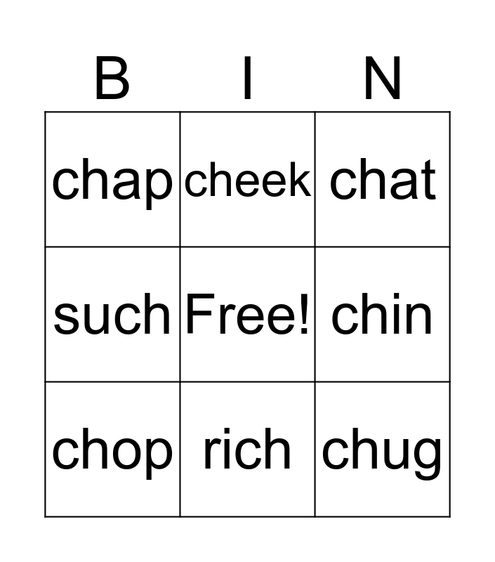 This bingo card has a free space and 8 words: chin, chat, cheek, chop, chap, chug, such and rich.