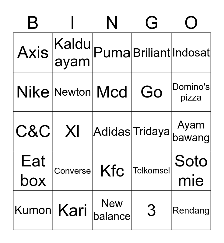 This bingo card has a free space and 24 words: Converse, Kari, Mcd, Kumon, Indosat, Axis, Nike, Kaldu ayam, Tridaya, Kfc, Go, C&C, Telkomsel, Soto mie, Newton, 3, Ayam bawang, Puma, Domino's pizza, Xl, Rendang, Eat box, Briliant and New balance.