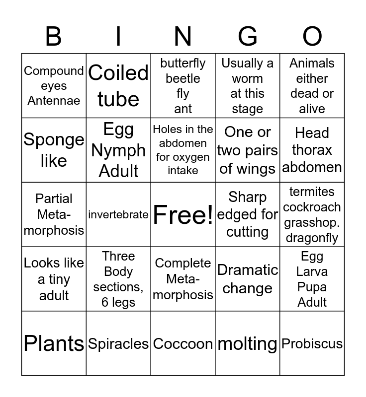 This bingo card has a free space and 24 words: Three Body sections, 6 legs, Spiracles, Holes in the abdomen for oxygen intake, Plants, Animals either dead or alive, Compound eyes Antennae, Sponge like, Coiled tube, Sharp edged for cutting, Complete Meta- morphosis, One or two pairs of wings, Partial Meta- morphosis, Dramatic change, Egg Larva Pupa Adult, Egg Nymph Adult, molting, termites cockroach grasshop. dragonfly, butterfly beetle fly ant, Head thorax abdomen, invertebrate, Probiscus, Looks like a tiny adult, Usually a worm at this stage and Coccoon.